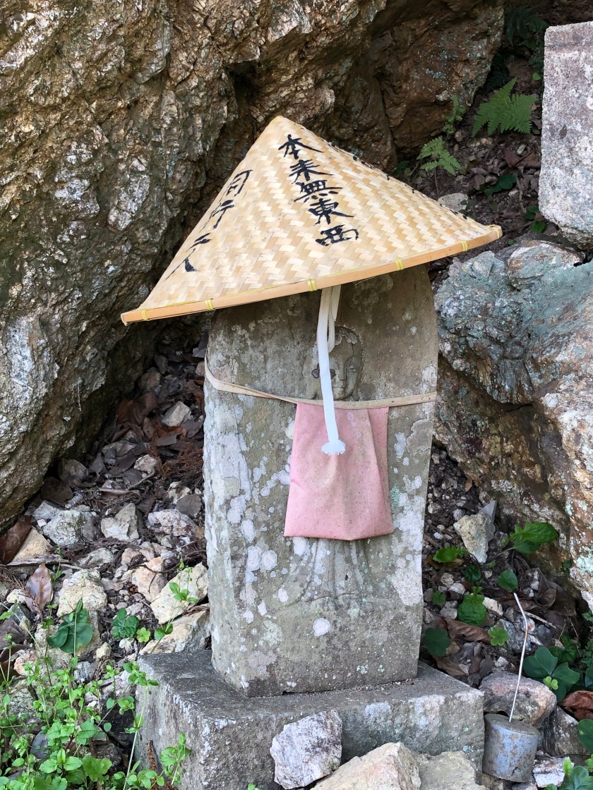 The sedge hat is part of the pilgrim attire. Four phrases of enrichment are written in Sanskrit on the hat. Though many henros faithfully wear the sedge hat, some henros find new owners for the hat.