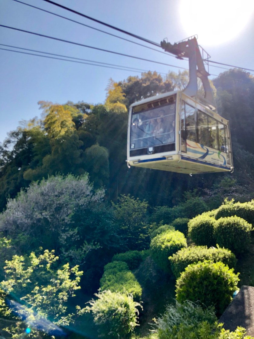The chairlift would not have been my first choice for riding to Matsuyama Castle. It’s too exposed for my comfort level. Can you believe there was no seat seat or lap bar? Obviously it would not have met OSHA standards. How had somebody no fallen from this chairlift? As the chairlift was Christine’s choice, off we went. It was truly an amazing ride having the wind and sun in your face. Unfortunately we missed the chairlift’s closing time for the return trip and had to ride in the rope line “gondola.” It probably met OSHA standards.