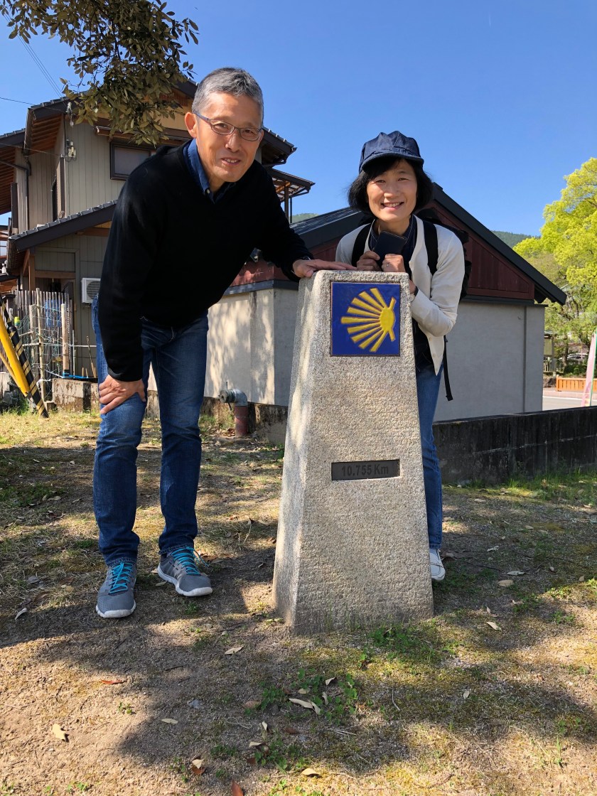- Saburo and Namiyo with a Santiago de Compostelle scallop stone marker