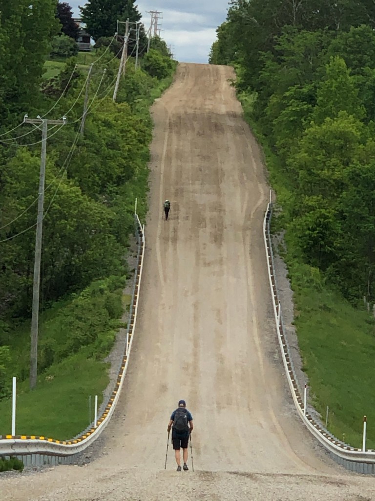 Today we got down to business with a longer walk on tired legs. Needless to say we were not as fresh as we were three days ago. No pun intended as no showers were provided thus far. Half the day’s walk was in proximity of noisy highways albeit on paved bike paths. Half the day’s walk was on dirt country roads serenaded by birds.