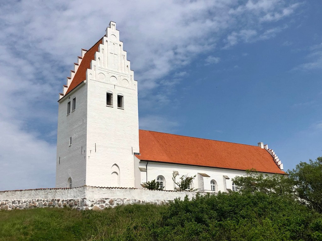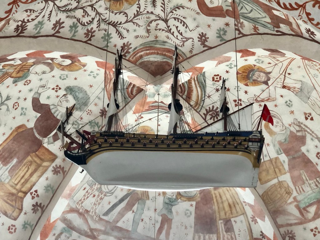 Dating to 1584, the Elmelunde Church is noted for its chalk painting. Ships suspended from the ceiling signify the role the church plays as a refuge from life’s storms.