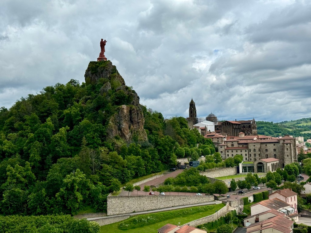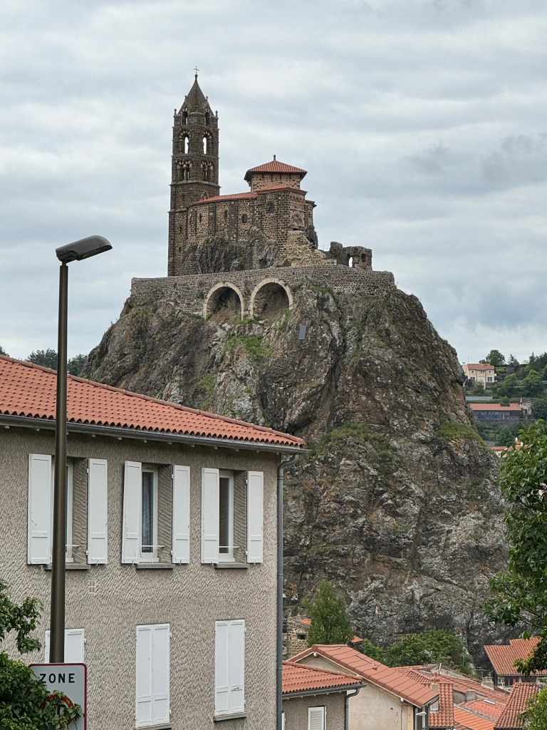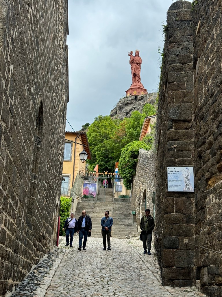 Much of the walk to Le Puy-en-Velay was on the road and in the rain. Once in Le Puy, the walk was along a quiet city promenade by the river. The cathedral is located in the old center, a tangle of streets. At the cathedral, I sensed more of the religious aspect of the Santiago de Compostelle Camino as this is a major starting point for the Camino. It is where I started ten years ago to walk 1,000 miles. I’m surrounded by many eager pilgrims who will start their walk tomorrow. I feel new anticipation. I have now walked across France from Swiss border to Spanish border.