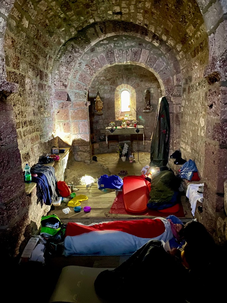 The two Parisian women still carry the “gift” of prepackaged food I refuse to eat. These gutsy frugal women spent the night in a chapel.