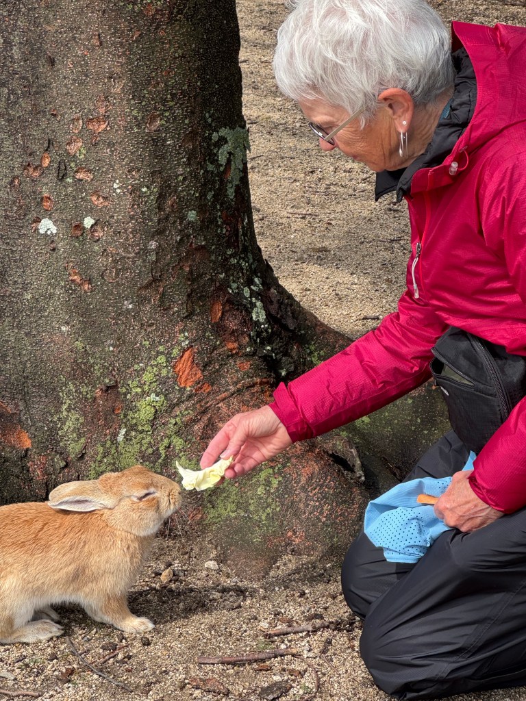 A dozen temples are situated on Mt Futaba overlooking Hiroshima. At one, a woman invited me inside. As a rule NO ONE goes inside a temple. She lit candles and incense. She invited me to sprinkle aromatic pellets in the incense container (Fortunately Namiyo and Saburo taught me this procedure). Upon leaving she gave me a small model of the Peace Pagoda. I got choked up from this emotional moment.