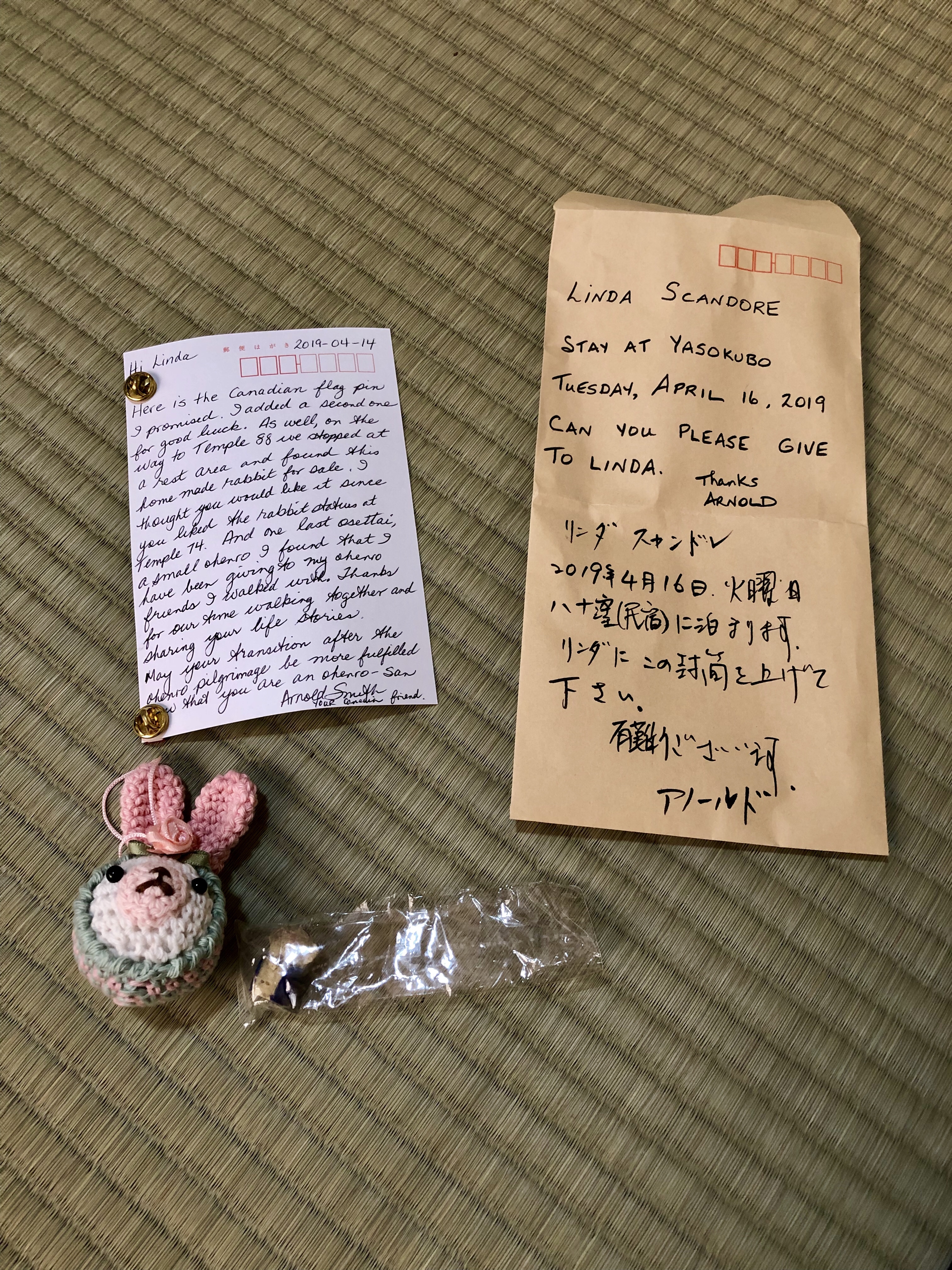 Arnold left me TWO Canadian label pins, the dearest miniature o-henro, a cat charm, and the warmest note. What a sweetheart!