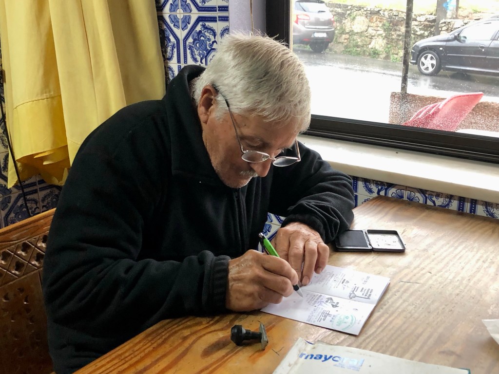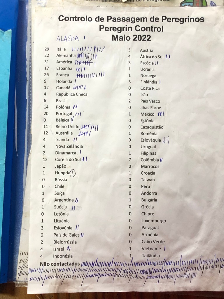 I’ve become a tic on a page. Since 2013, the café proprietor keeps a yearly account of the nationality of pilgrims. He’s anxious I mark my tic and shows no concern that water is flooding off me onto the dry floor.