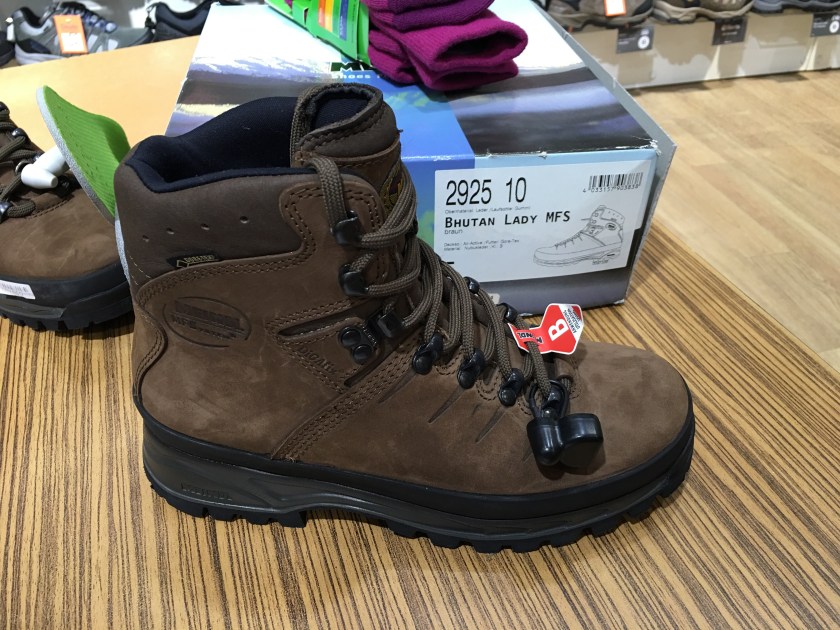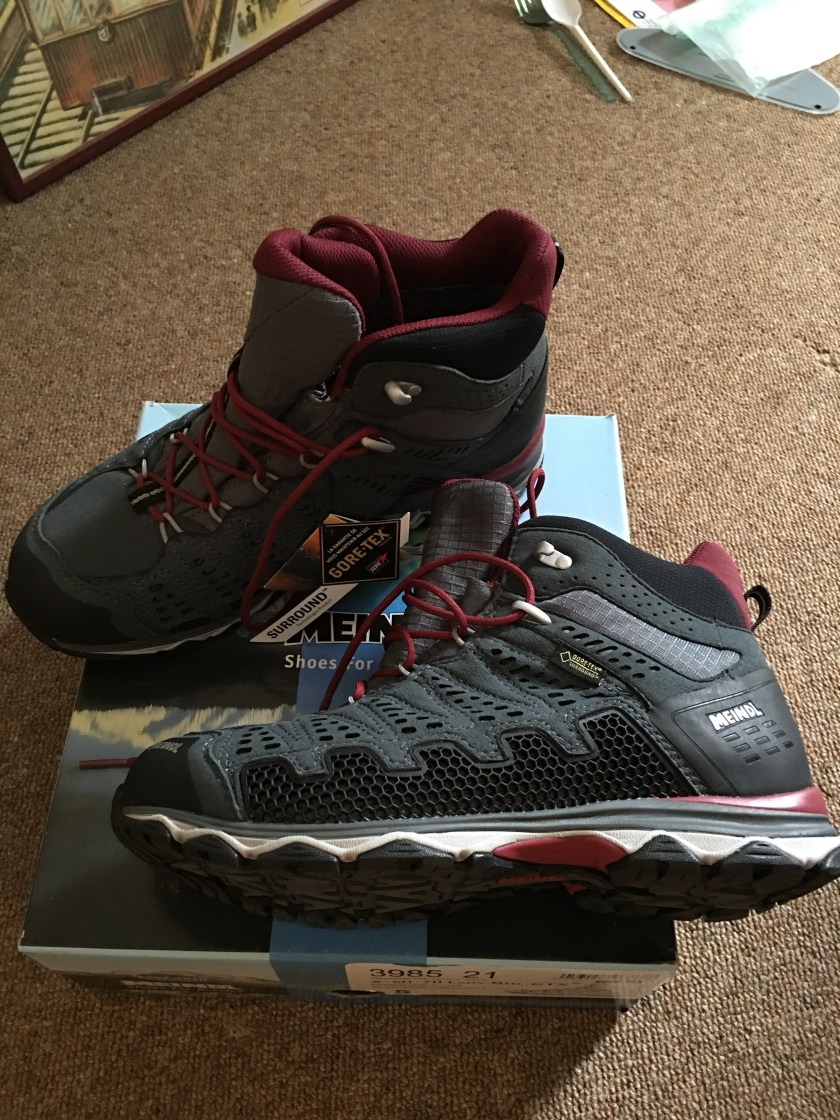 Change of heart. I exchanged the newly purchased Meindl leather boots for light weight Meindl Gortex boots. Having walked 650 miles in trail running shoes, I know the virtue of light and flexible shoes.