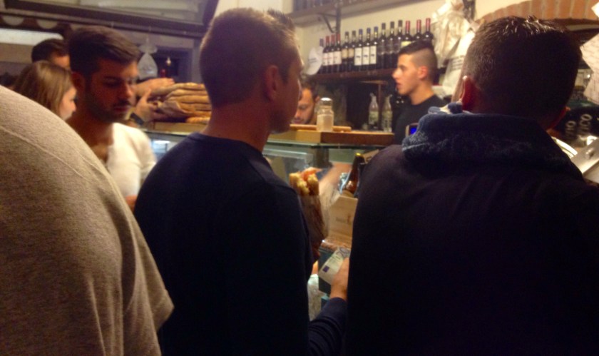 Follow your nose for good food. Don’t rely on the popularity of a restaurant. Good food has aroma that excites the taste buds. Passing a woman on the street, I could smell her sandwich. This became a trail of good smells that lead me to All’Anyico Vinaio. The shop had a line of people, all waiting to order the hugest and tastiest sandwiches, blocking the street. I could only manage eating half my $6 incredible sandwich. Glass of wine, $3.50.